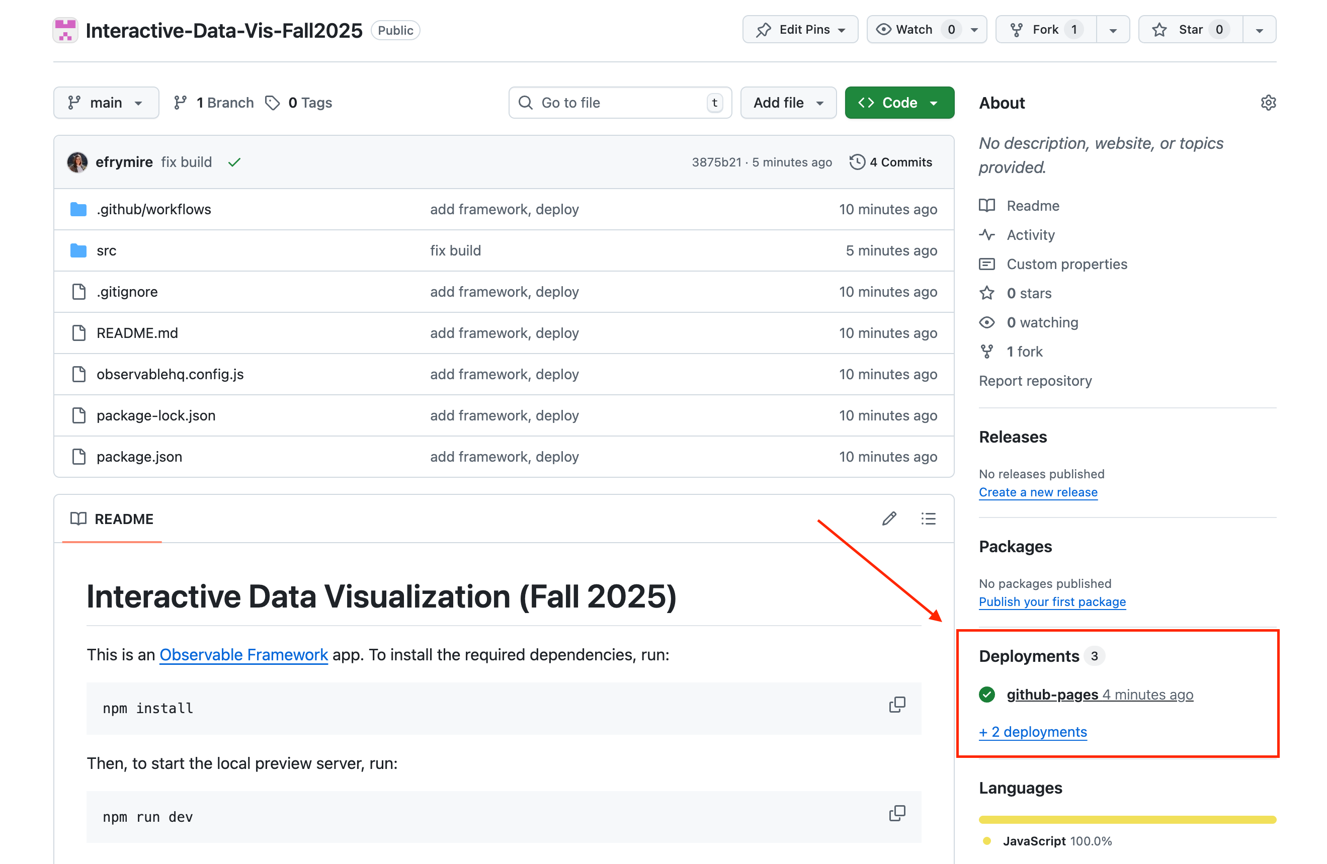 Once you have pushed a change, you can see all the deployments triggered from pushed in the deployments section of your repository page. These will not be triggered until you make a change to your repo and push it back up to github.