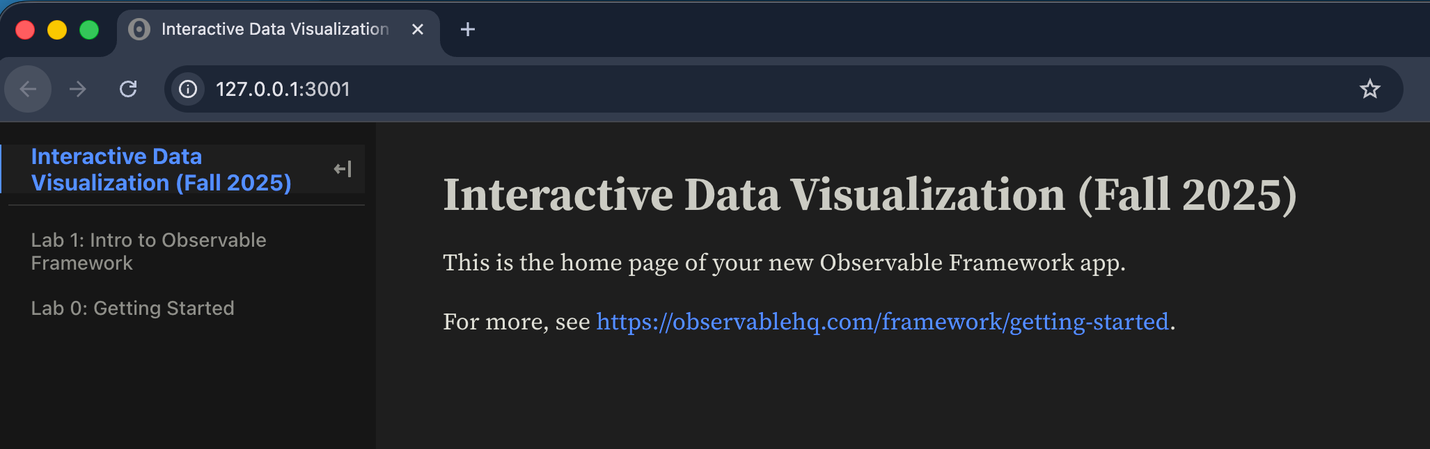 Your terminal will now begin serving the code at the listed url. This can be http://127.0.0.1:3000/ or another port (e.g., :3001). The listed url in your terminal is where your code is served. Navigate to that link in your browser. You should see the code from the class repository.