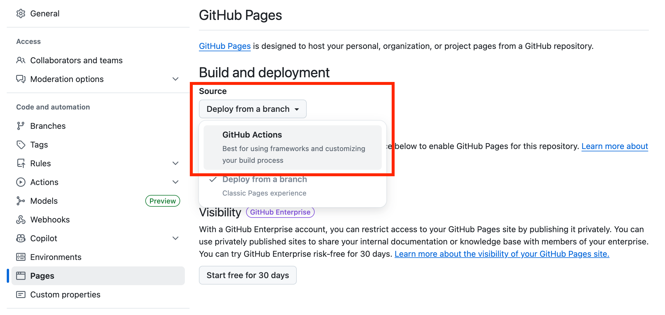 To set up your github pages site, you can go to your repository's Settings tab and then scroll down to Pages section. Select Github Actions as source ("Deploy from a branch").